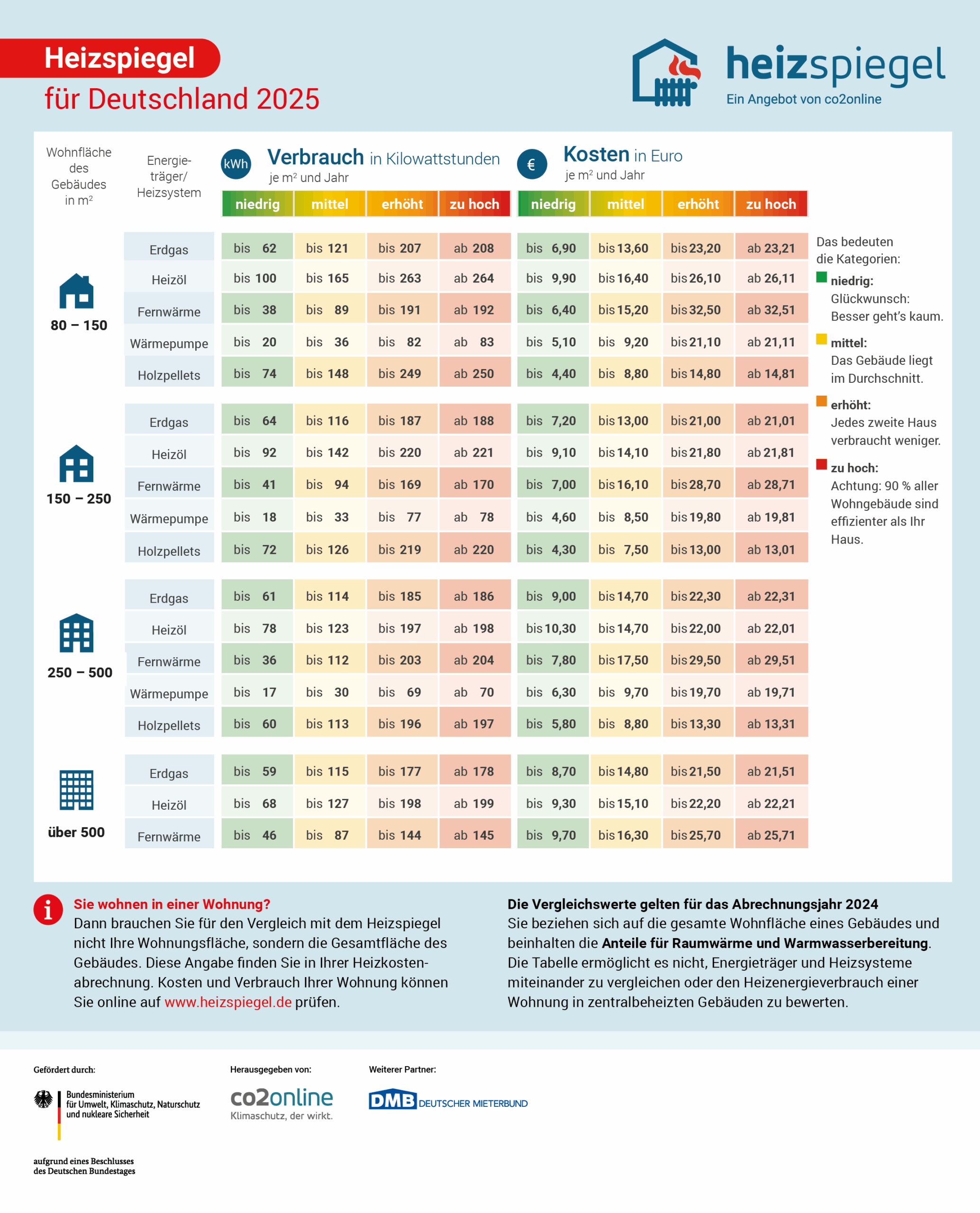Mit dem Heizspiegel vergleichen Sie Ihren Heizenergieverbrauch und Ihre Heizkosten mit den Werten ähnlicher Haushalte. Der aktuelle Heizspiegel für Deutschland (www.heizspiegel.de) wurde herausgegeben von der gemeinnützigen Beratungsgesellschaft co2online. Für die deutschlandweiten Vergleichswerte zum Heizen wurden über 140.000 Gebäudedaten ausgewertet.